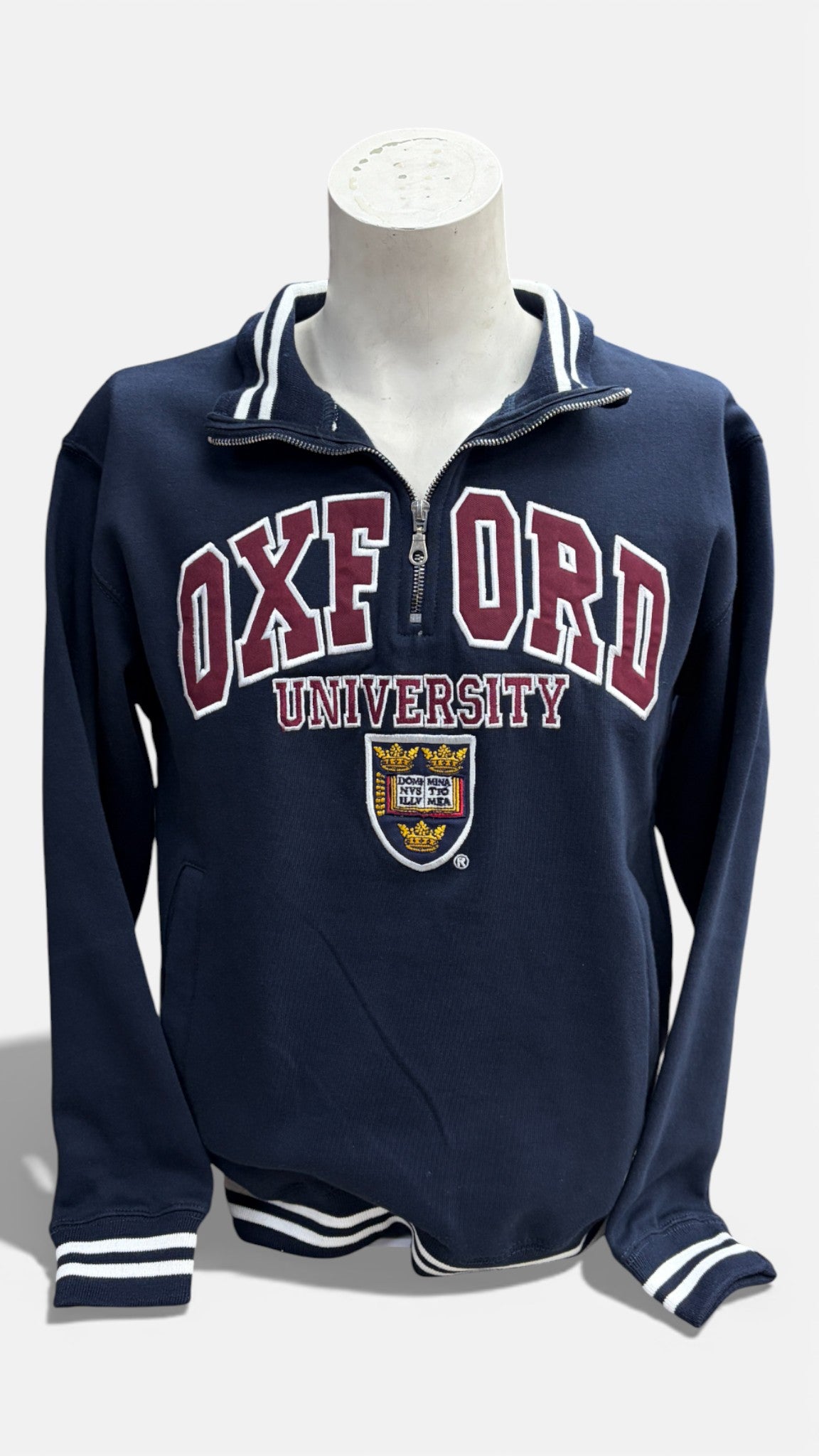 A classic half-zip sweatshirt designed in a traditional collegiate style. Features a structured stand collar with zip fastening, ribbed cuffs and hem, and a comfortable regular fit. Finished with bold Oxford University lettering and an embroidered crest on the chest, reflecting heritage university design. Smart yet casual, this versatile piece is ideal for everyday wear or layering throughout the seasons.